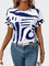 Trumpomis rankovėmis bliuska balta spalva su mėlynomis abstrakčiomis geometrinėmis formomis siūlo modernų ir gaivų stilių. Jos laisvas pritaikymas daro ją idealia kasdieniams pasirodymams, o ją galima dėvėti tiek su džinsais, tiek su sijonais, kad atrodytų elegantiškiau.