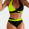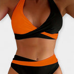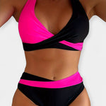 Šis seksualus dviejų dalių bikini nustebina savo minimalistiniu dizainu ir kryžminiu akcentu ant dekoltė. Jis subtiliai pabrėžia moteriškumą, idealiai tinka elegantiškoms išvaizdoms paplūdimyje ar jūsų vasaros pabėgimuose.