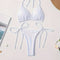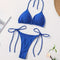 Šis modernus bikini rinkinys pabrėžia moteriškumą elegantišku ir drąsiu būdu. Halterio tipo viršus suteikia stabilumą ir palaikymą, o V formos kelnaitės pagražina klubus ir suteikia žavingą siluetą — puikiai tinka įspūdingoms vasaros išvaizdoms.