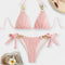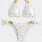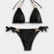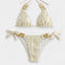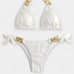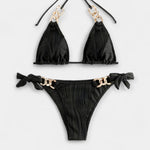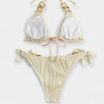 Modernus ir žavus, šis dviejų dalių bikinis stebina reljefiniu juostuotu audiniu ir auksinėmis detalėmis žiedų ir grandinėlių pavidalu. Halter tipo iškirptė ir trikampis viršus pabrėžia krūtinę, o šone esantis peteliškė suteikia žaismingumo – puikus pasirinkimas stilingam poilsiui prie baseino ar paplūdimyje.