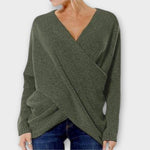 ✔️ Stilingas V-žandikaulio dizainas: Modernus kryžminis V-žandikaulis ir asimetrinė apačia suteikia ypatingą akcentą šiam megztiniui.