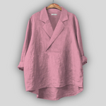 Elegantiška lininė bluzonė švelnios spalvos, kuri skleidžia moteriškumą ir laiką nepaisantį stilių. Ji turi V formos iškirptę ir elegantišką apykaklę, o laisvas siluetas užtikrina komfortą visą dieną. Asimetrinė apdaila su ilgesne nugara suteikia modernumo bet kokiam įvaizdžiui.
