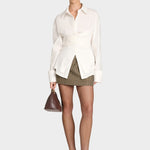 Parodykite savo eleganciją ir dinamiškumą su šiuo ruduo marškiniu su apvyniojimu, derinamu su mini kariniu sijonu. Išskirtinis dizainas su apvyniojimu juosmens srityje pabrėžia siluetą ir suteikia išvaizdą, kuri sujungia moteriškumą ir profesionalumą.