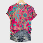 Išsiskirkite su šiuo ryškiu marškinėliu, kuriame gausu intensyvių fuksijų ir turkio atspalvių, su įspūdingais spalvingais raštais. Jo laisvas dizainas su trumpomis rankovėmis ir patogus pritaikymas daro jį idealiu pasirinkimu vasaros išvykoms, kasdieniams pasivaikščiojimams ir energingoms, stilingoms atsitiktinėms išvaizdoms.