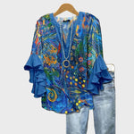 Parodykite savo meninį stilių su šiuo ryškiu mėlynu marškinėliu, papuoštu spalvingais abstrakčiais raštais ir detalėmis, primenančiomis tapybos drobę. Volanų rankovės suteikia elegancijos ir judesio, o patogus siluetas daro jį idealiu kasdienėms ir ypatingoms progoms.