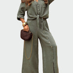 Moteriškas **kombinezonas** chaki spalvos su elegantišku ir patogiu dizainu, kuris skleidžia neįpareigojančią eleganciją. Turi **mygtukus viršuje**, diržą, kuris susiriša ties juosmeniu, kad pabrėžtų moterišką siluetą, ir **platus kelnes su mygtukais šone**, kurios suteikia judėjimo ir stiliaus. Idealiai tinka kasdienėms išvaizdoms, taip pat ir vakariniams pasirodymams su tinkamais aksesuarais.