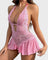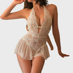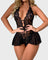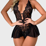 Šis seksualus juodasis bodis su nėriniais ir permatomomis detalėmis sukuria visiškai moterišką ir viliojantį efektą. Drąsių iškirpimų ir gėlių detalių dizainas pabrėžia siluetą, o trumpas volanas apačioje prideda žaismingos elegancijos.