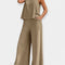 Įspūdingas vienspalvis rinkinys, kuris skleidžia dinamiškumą ir moteriškumą. Be rankovių viršus derinamas su plačiomis kelnėmis, suteikiančiomis neįpareigojantį stilių ir kasdienį komfortą. Lengvas audinys daro jį idealiu šiltoms pavasario ir vasaros dienoms.