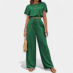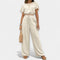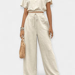 Šis komplektas išsiskiria laisvu siluetu ir absoliučiu patogumu, kurį siūlo. Trumpas topas su pūkuotomis rankovėmis harmoningai derinamas su aukštu juosmeniu kelnėmis su raišteliu, sukuriant stilingą įvaizdį su boho akcentais – idealiai tinka karščiausioms metų dienoms.