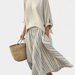 Natūralus ir elegantiškas, Daisy komplektas švenčia Viduržemio jūros gaivumą su minkšta palaidine plačiomis rankovėmis ir lengvu midi sijonu su dryžiais. Pagamintas iš minkšto lino bambuko su švelnia tekstūra ir sklandžiu kritimu, tai ideali pasiūla saulėtoms dienoms, pajūrio pasivaikščiojimams ar ramioms stilingoms atostogoms.