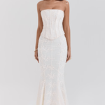 Išskirtinė ir moteriška suknelė su korsetu, kuris pabrėžia siluetą ir suteikia nepamirštamą eleganciją. Prigludusi forma akcentuoja formas, o nėrinių detalės prideda romantikos ir prabangos. Ideali vestuvėms, oficialiems renginiams ir unikalioms vakarėliams.
