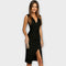 - Įspūdingas dekoltė: V formos iškirpimas subtiliai paryškina krūtinę, pridėdamas elegancijos.
