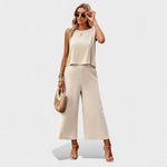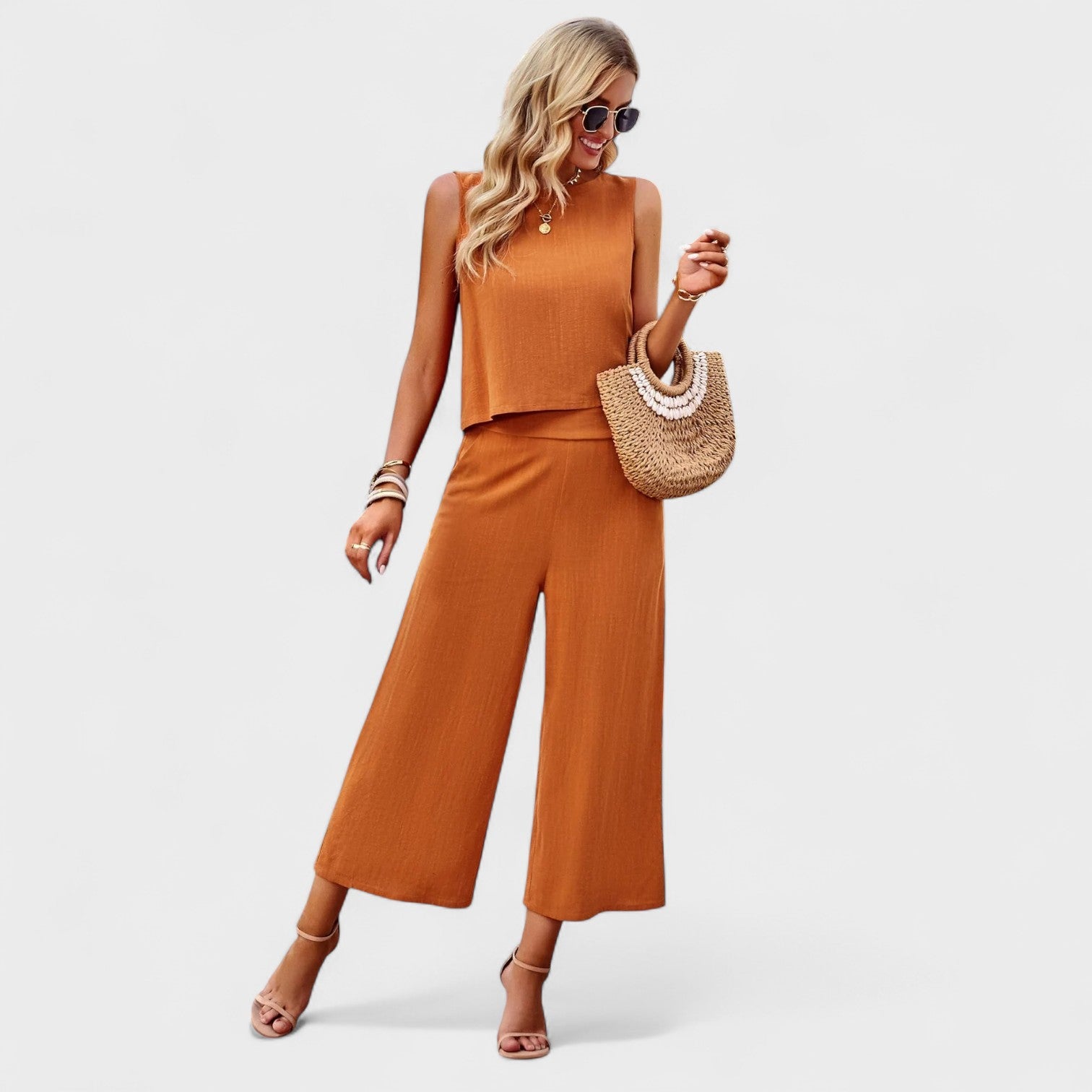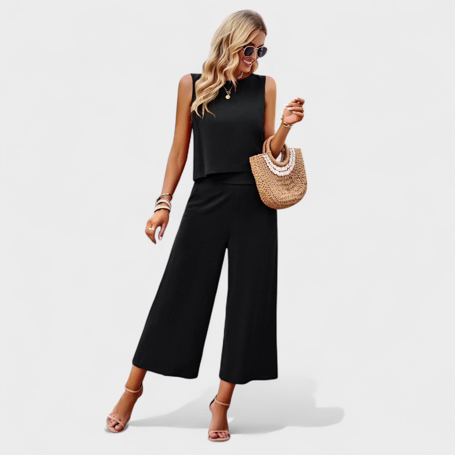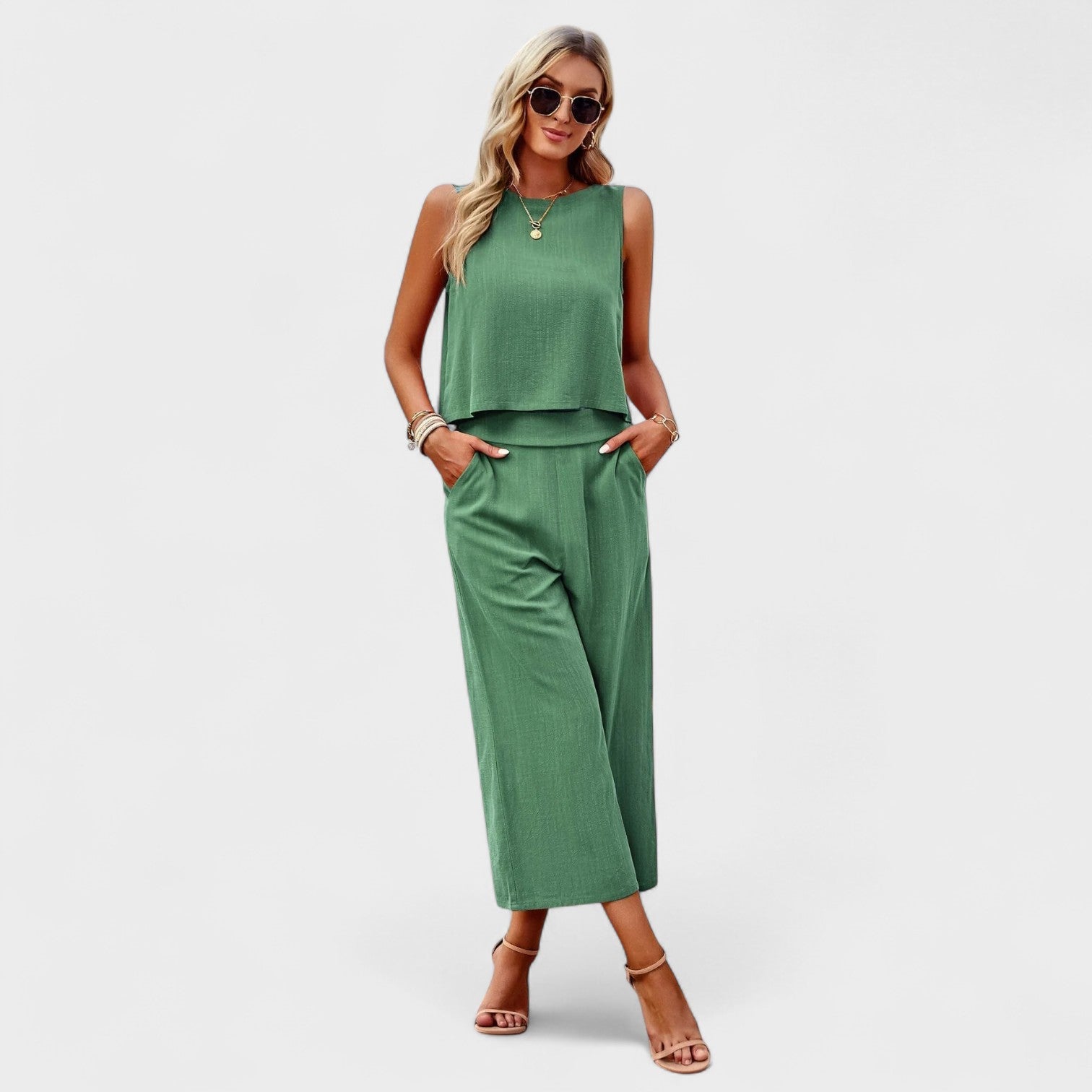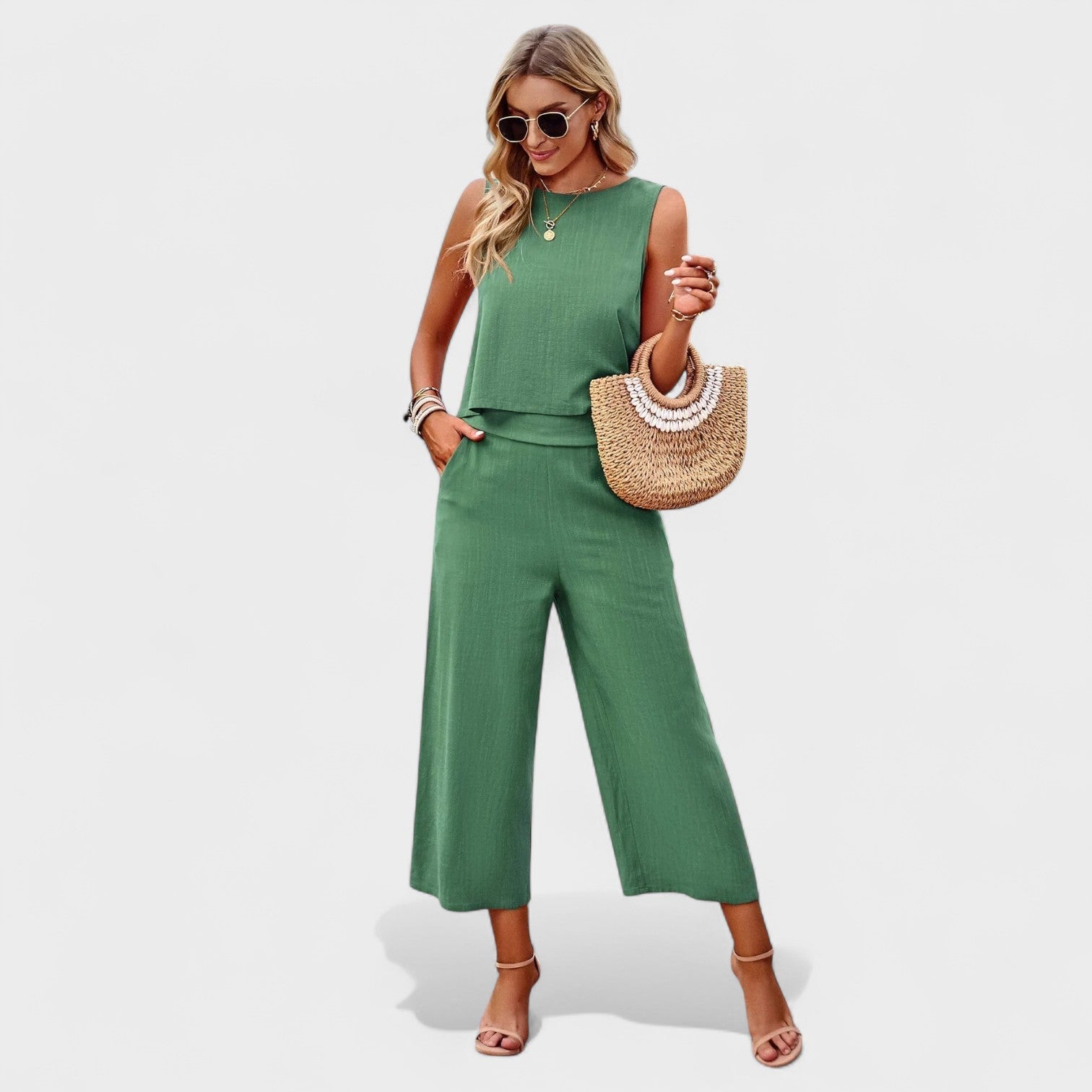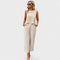 Šis lino komplektas yra puikus pasirinkimas tiems, kurie vertina eleganciją be pastangų. Su tiesiu kirpimu be rankovių ir aukštu liemeniu, jis suteikia modernų, gaivų ir itin patogų įvaizdį.
