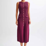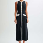 Elegantiška be rankovių megzta suknelė su mygtukais visame ilgyje. Tiesi linija suteikia laikinojo elegancijos, o mygtukų kišenės prideda rafinuotą detalę. Idealus pasirinkimas nuo ryto iki vakaro.