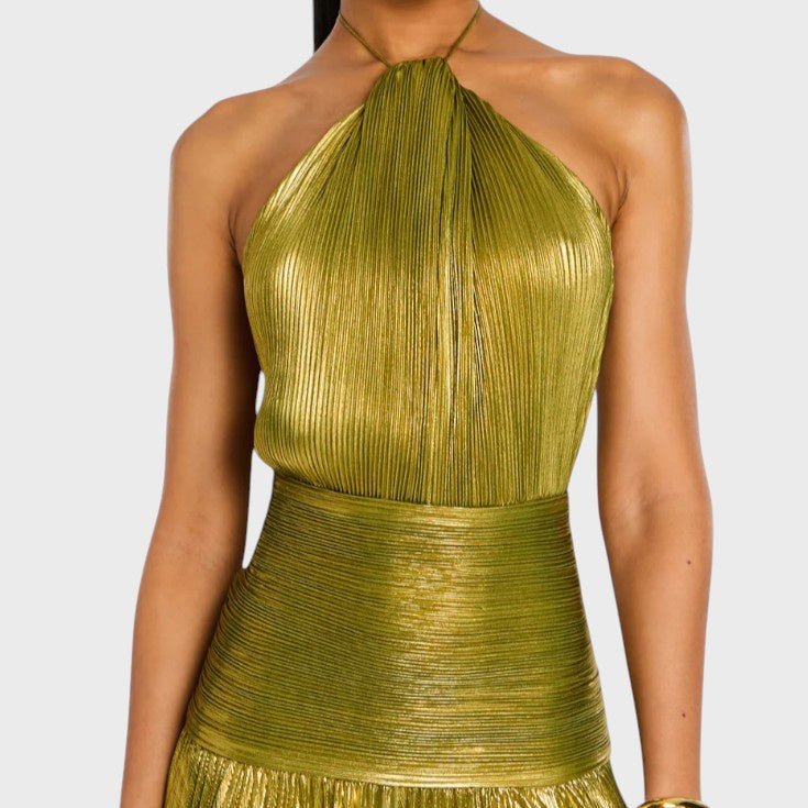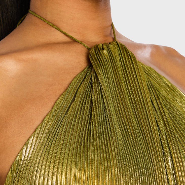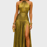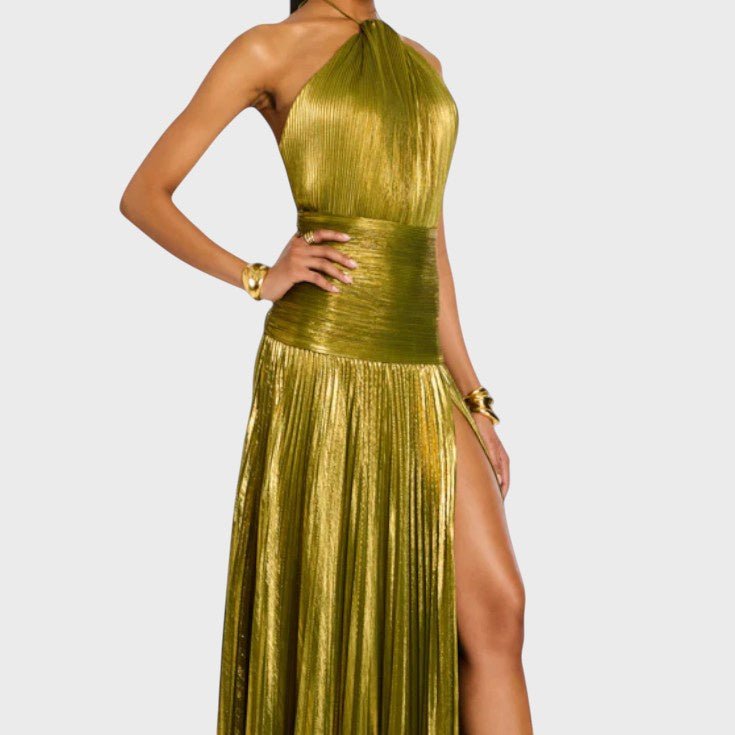 Suknelė Laumė žavi savo metaliniu peridoto atspalviu, plazdančia siluete ir rafinuotais detalėmis. Su halterio iškirpte, atvira nugara ir aukštu skeltuku, ji jungia drąsą ir eleganciją – ideali galoms, vakarienėms ir nepamirštamoms naktims, kupinoms mistikos ir moteriškumo.