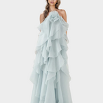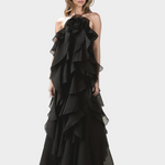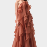 Ši nuostabi ilga suknelė šiltu kaštoniniu atspalviu skleidžia prabangą ir romantiką. Sukurta su daugiapakopiais volanais iš lengvos ir oro pralaidžios medžiagos, ji sukuria įspūdingą judėjimą kiekviename žingsnyje.