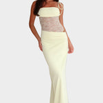 Parodykite savo moteriškumą ir eleganciją su šia ilga suknele švelnioje pastelinių geltonų atspalvių. Išskirtinės nėrinių detalės krūtinėje kartu su prigludusia apatine dalimi sukuria itin patrauklią ir rafinuotą išvaizdą, puikiai tinkančią vakariniams pasivaikščiojimams ar ypatingoms progoms.