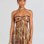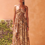 Įspūdinga maxi suknelė su prabangiu paisley raštu auksinėmis, rudos ir plytų atspalviais. Be petnešėlių liemuo su įspūdinga iškirpte ir elegantiškais įpjovimais pabrėžia moteriškumą, o lengva sijonas suteikia judėjimo ir elegancijos. Ideali vakariniams pasimatymams, kokteilių vakarėliams ir vasaros progoms, reikalaujančioms glamūrinio įvaizdžio.