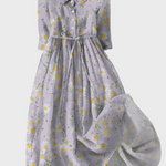 Ši žavinga ilga suknelė švelnios alyvinės spalvos yra ideali pasirinkimas šviežiam ir pavasariškam įvaizdžiui. Jos subtilus dizainas su baltomis ir geltonomis ramunėmis suteikia lengvumo ir džiaugsmo nuotaiką, o juostos viduryje užtikrina puikų prigludimą.
