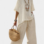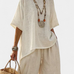 Švari paprastumas su natūralia elegancija. Daisy rinkinys išsiskiria laisva ir monochromine siluetu, idealiai tinka tiems, kurie ieško komforto ir švaraus stiliaus. Pagamintas iš lengvos medžiagos, ši išvaizda lydi kiekvieną judesį su gaivumu ir elegantišku laisvumu.