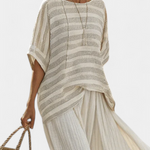 Laisvas ir su natūralia žavesiu, Daisy komplektas derina dryžuotą palaidinę su minkšta linija ir laisvus kelniais su plačia apykakle. Lino bambuko konstrukcija suteikia gaivumą, švelnią tekstūrą ir judėjimą, idealiai tinka šviesioms dienoms paplūdimyje arba ramiai pasivaikščiojimams mieste.