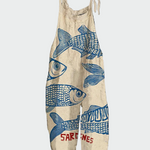 Jūrinės sardinės yra jumpsuit su ryškiu meniniu akcentu ir žaismingu charakteriu. Smėlio spalvos fonas kartu su mėlynomis žuvų grafikomis ir detale „SARDINES“ apačioje suteikia unikalią, jūrinę aurą.