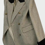 Įspūdingas švarkas su dvigubu uždarymu, suteikiantis laikui nepavaldią eleganciją kiekvienai išvaizdai. Jame yra elegantiška apykaklė su kontrastinga tekstūra ir priekiniai mygtukai, kurie užbaigia sofistikuotą įvaizdį. Puikiai tinka kasdieniams chic deriniams, taip pat ir profesionalioms progoms.